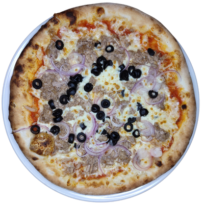 Base de tomate, mozzarella, atum, cebola roxa , azeitonas e oregãos