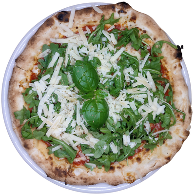 Base de tomate, mozzarella de búfala, rúcula, parmesão, manjericão e oregãos